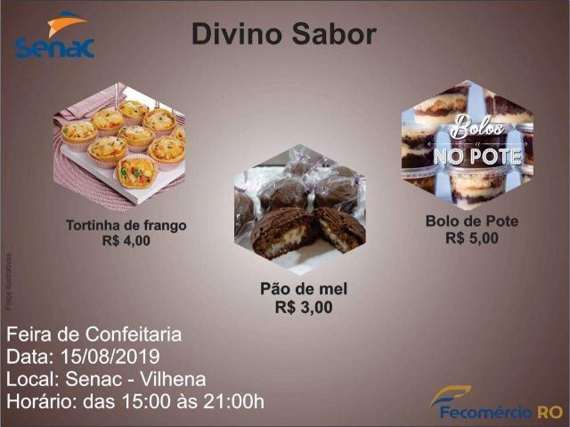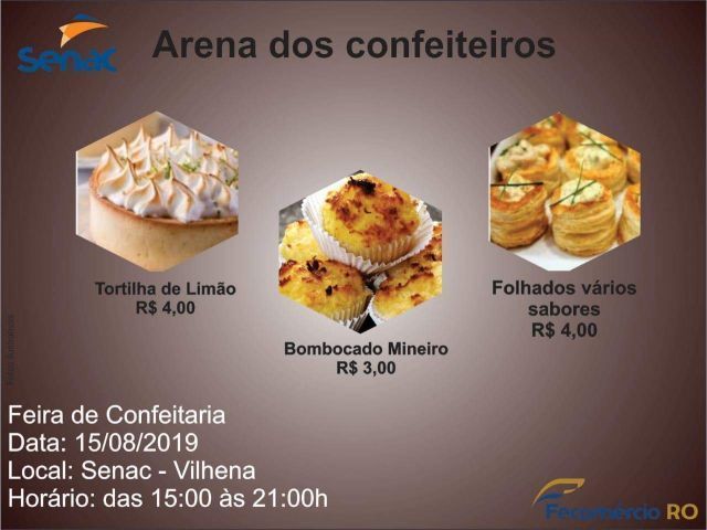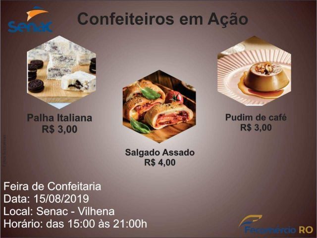 A turma de confeiteiros de 2019 do Serviço Nacional de Aprendizagem Comercial – Senac Vilhena, realizará nesta quinta-feira (15), a partir das 15h, uma feira com a venda de deliciosos doces e salgados para a população.