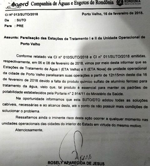 A Diretora Técnica e Operacional da Companhia de Água e Esgoto do Estado de Rondônia (CAERD), Rosely Aparecida de Jesus, informou no último dia (16), que as Estações de Tratamento I e II de Porto Velho/RO tiveram suas distribuições paralisadas nesta data na Capital, pelo motivo da falta de Sulfato de Alumínio Ferroso, um dos principais produtos químicos, que fazem a limpeza da água no seu primeiro processo de tratamento.