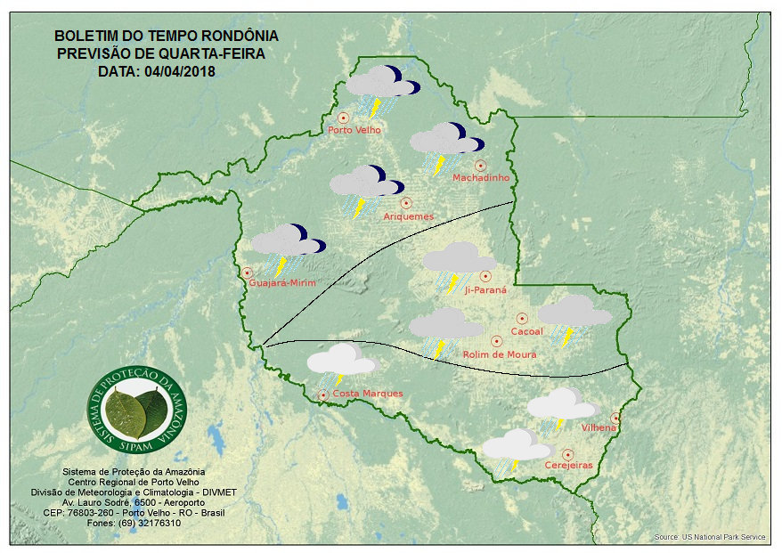 A Divisão de Meteorologia do Sistema de Proteção da Amazônia (Sipam), informa que o tempo segue instável em grande parte do Estado nessa quarta-feira, 04. As chuvas ocorrem em forma de pancadas seguidas de trovoadas em todo Estado e de forma isolada no Vale do Guaporé na região de Costa Marques e Cone Sul Rondoniense.
