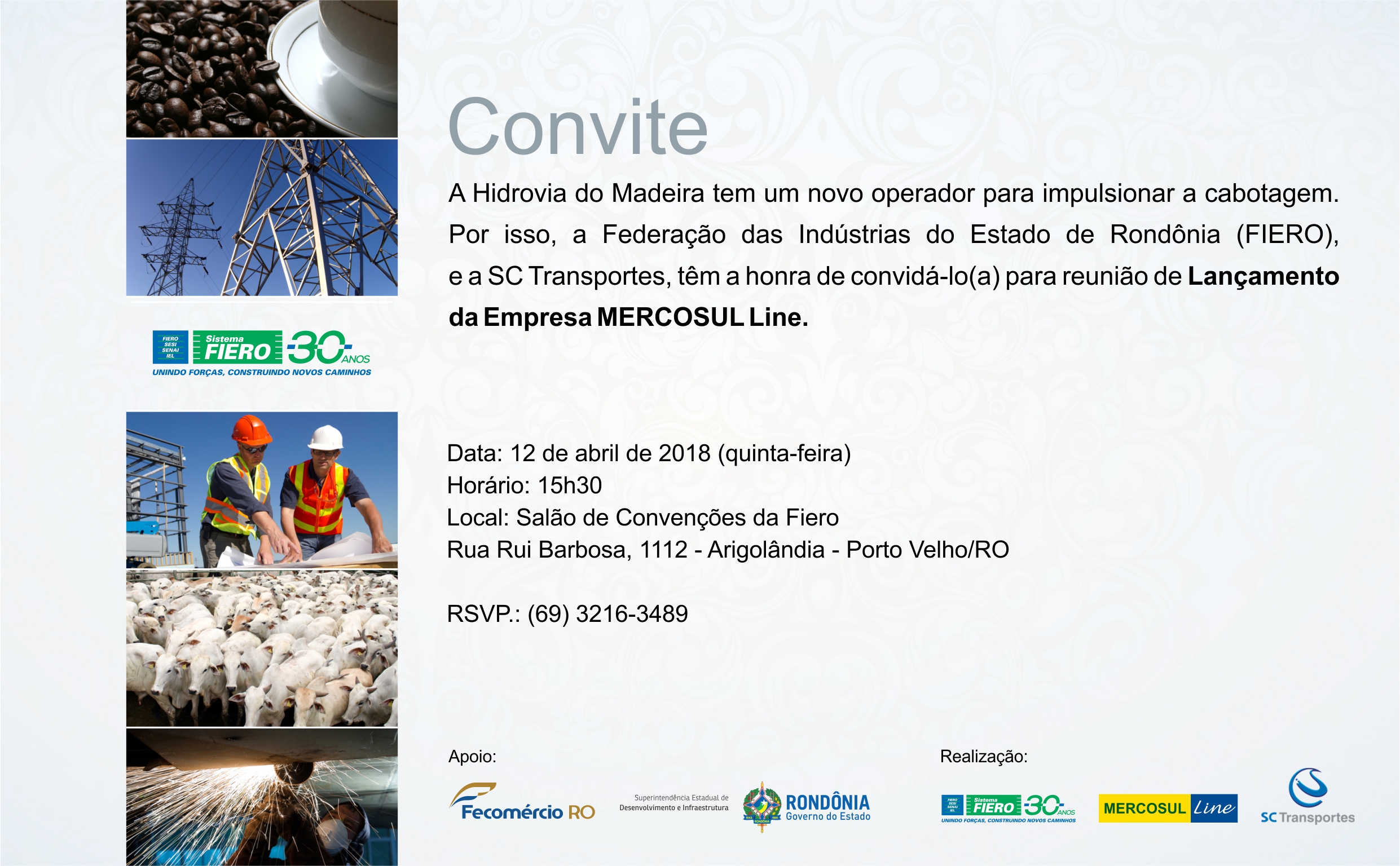 A Mercosul Line vem a Rondônia apresentar sua atuação nos serviços de cabotagem em Porto Velho com movimentação em todos os tipos de cargas. A apresentação aos representantes das instituições públicas, privadas e empresários, acontece nesta quinta-feira, 12, no salão de convenções do Sistema Fiero, em Porto Velho, a partir das 15h30, com a participação do presidente Marcelo Thomé, diretores, conselheiros, dentre outros convidados.