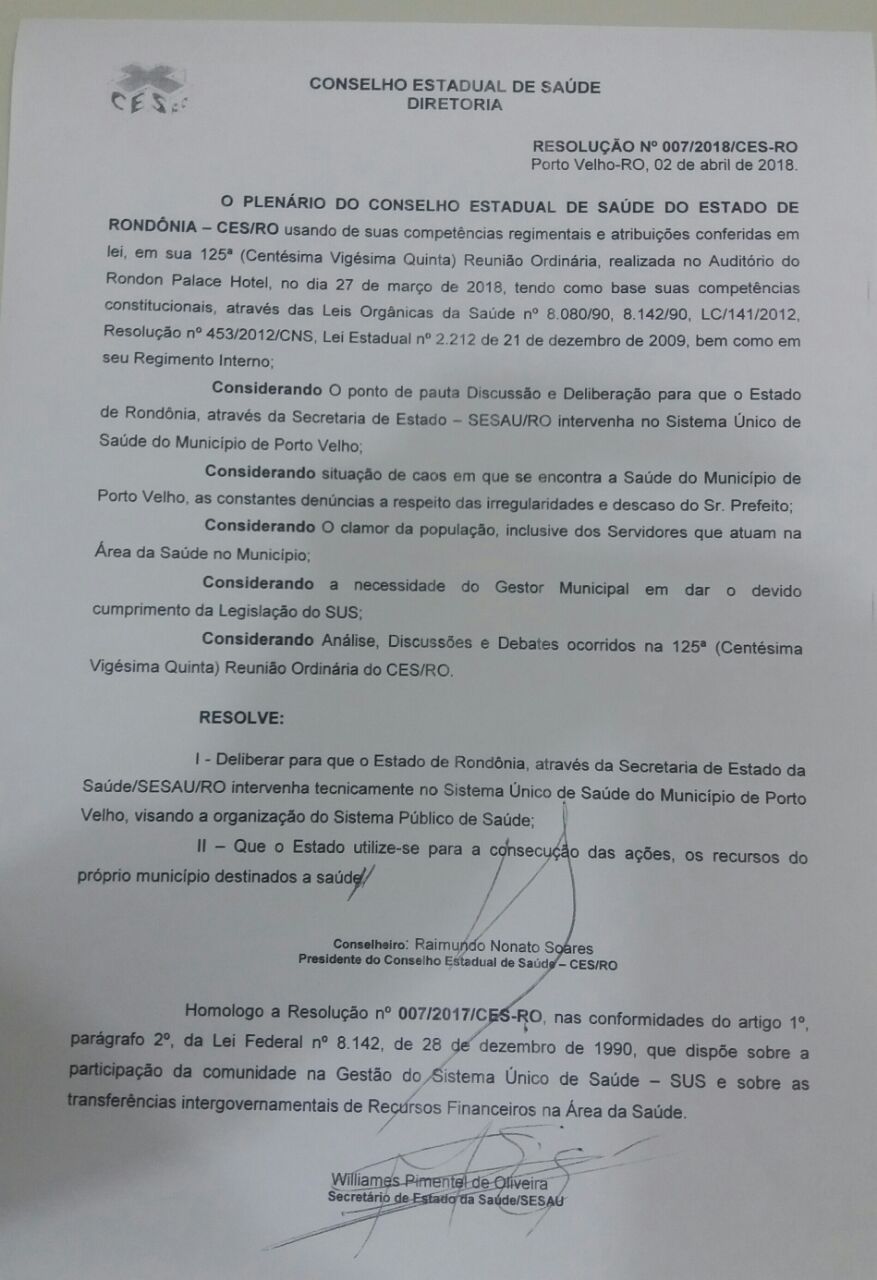 O secretário estadual de saúde, Luiz Maiorquin, homologou na manhã da última quinta-feira 12.04 as duas Resoluções aprovadas há duas semanas que tratam da intervenção na saúde do Município e no Conselho Municipal de saúde de Porto Velho.