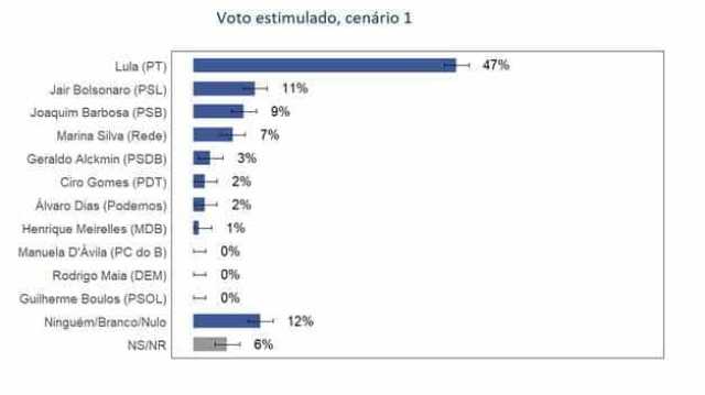 Nos dois cenários estimulados, um com o presidente Michel Temer e outro com o ex-ministro da Fazenda Henrique Meirelles, Lula aparece com 47% das intenções de voto. O segundo colocado, Bolsonaro, tem 11% no cenário com Meirelles e 12% com Temer. Tanto o atual presidente quanto o ex-ministro da Fazenda não ultrapassam a marca de 1%.