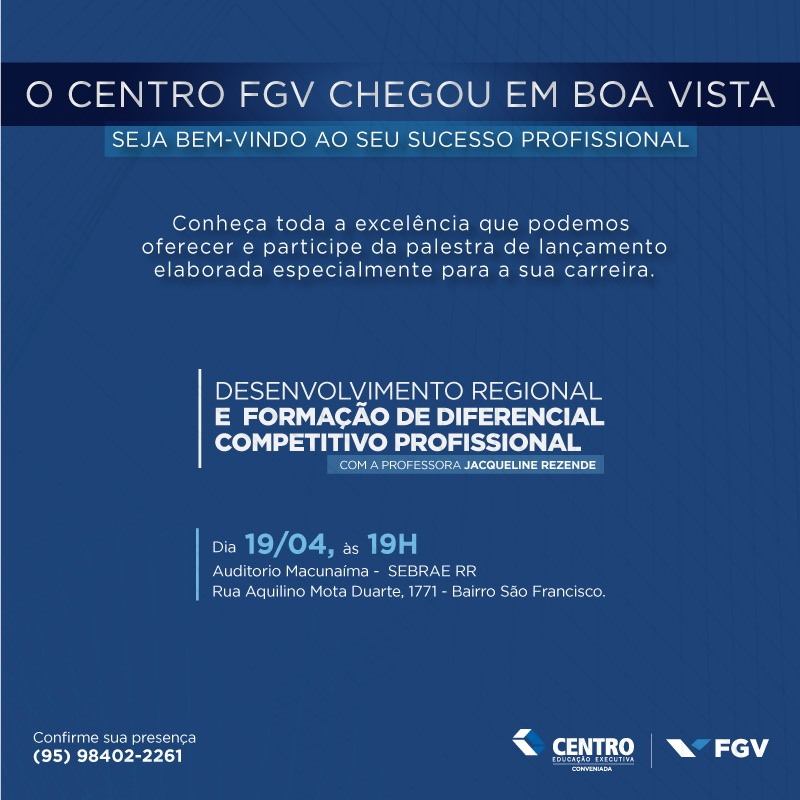 As vagas são limitadas. Mais informações pelo telefone (95) 99802-2261 ou pelo e-mail boavista@centrofgv.com.br