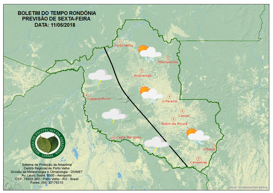 Apenas no Vale do Guaporé o tempo varia de parcialmente nublado a nublado, com pancadas isoladas de chuva e trovoadas a partir da tarde.