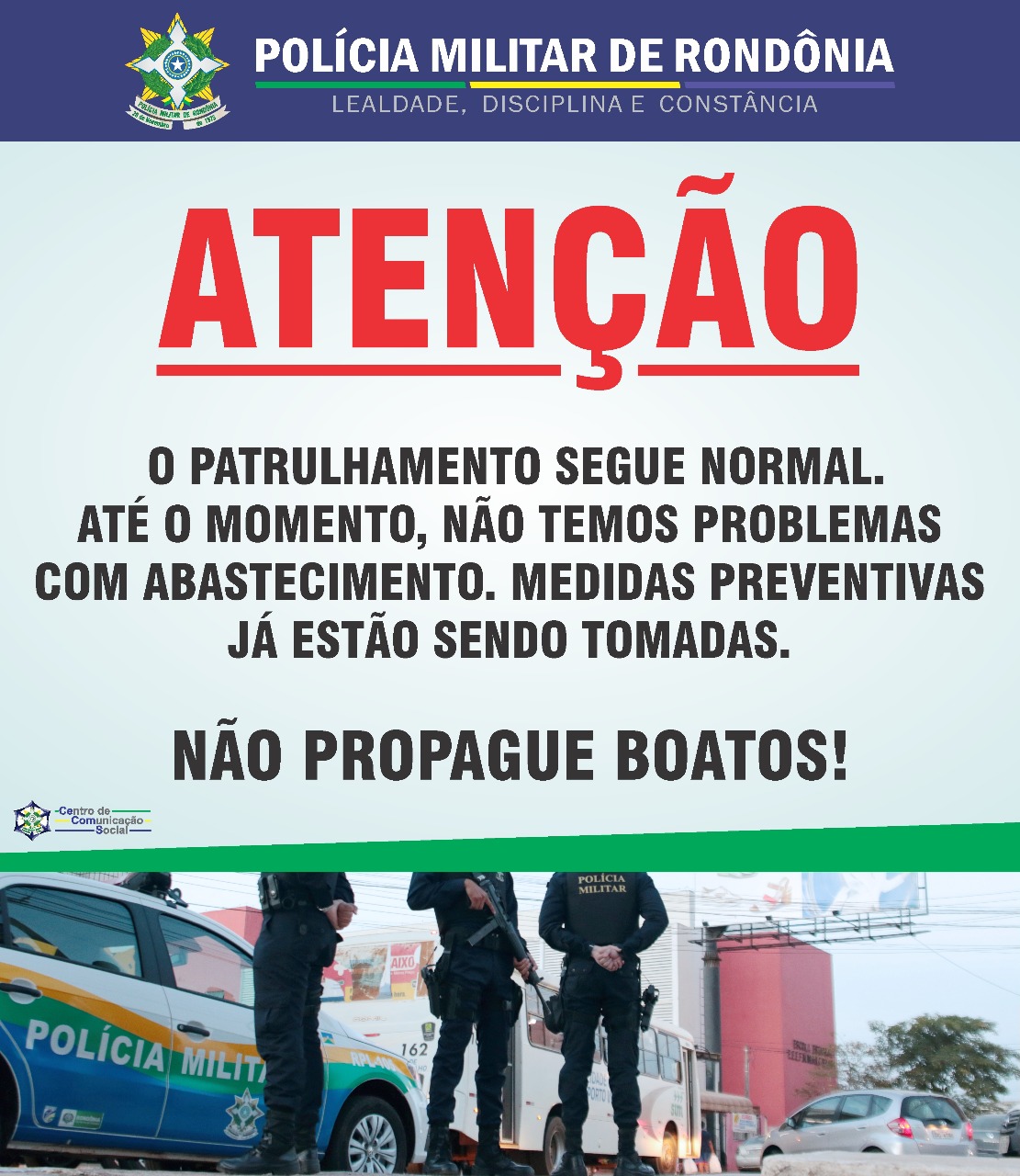 O diretor executivo da Astir, CB PM Alan Mota informa os associados e a população em geral que de acordo com o chefe do Centro de Comunicação Social da PM RO (CECOMS PM RO), CAP PM Miranda o patrulhamento está transcorrendo normalmente. “O que podem existir são boatos não confirmados pelo CECOMS PM RO, confira abaixo as imagens publicadas em redes sociais”, disse Alan Mota.