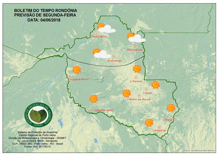 A Divisão de Meteorologia do Sistema de Proteção da Amazônia informa que a semana começa com céu claro em todas as regiões do Estado, com exceção do centro-norte Rondoniense que começa do dia com o céu claro variando a céu parcialmente nublado no período da tarde, podendo acontecer pancadas ocasionais de chuvas nessa região.