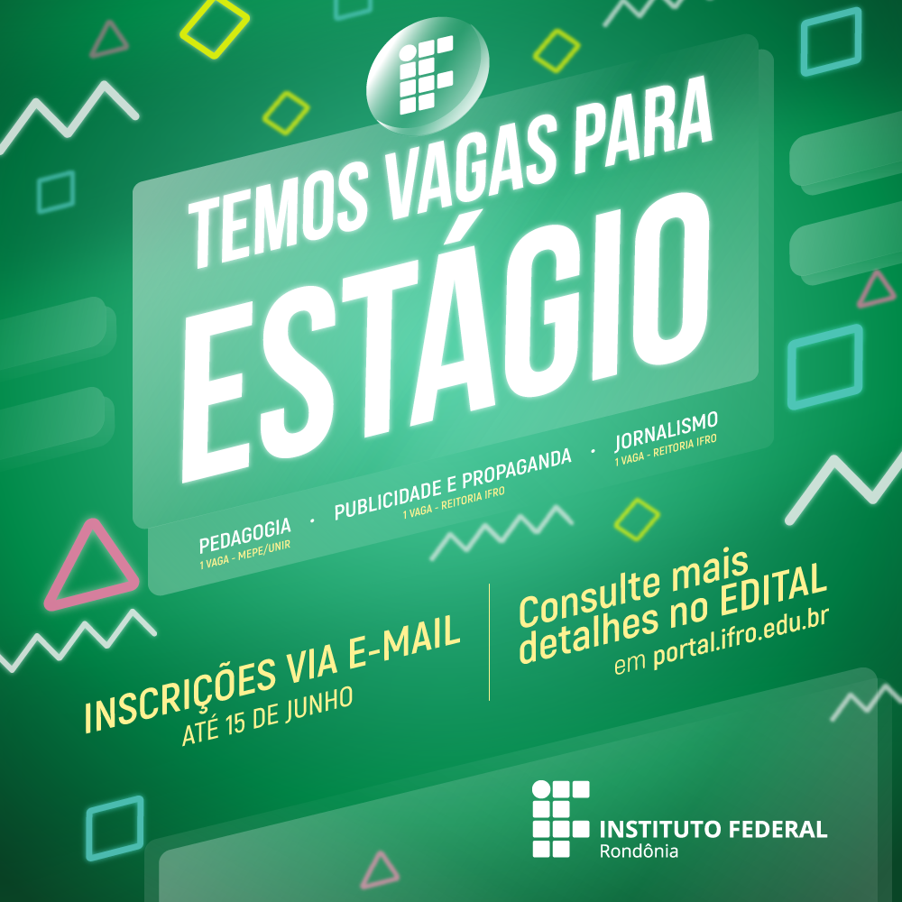 O IFRO (Instituto Federal de Educação, Ciência e Tecnologia de Rondônia) realiza até o dia 15 de junho, Processo Seletivo para estágio na Reitoria em três áreas do ensino superior: Pedagogia, Jornalismo e Publicidade e Propaganda. A seleção, feita pela Diretoria de Gestão de Pessoas do IFRO, prevê atuação no município de Porto Velho. Os estudantes selecionados para o estágio não obrigatório terão carga horária semanal de 30 horas, com Bolsa-Estágio de R$ 520, mais Auxílio-Transporte de R$ 132.