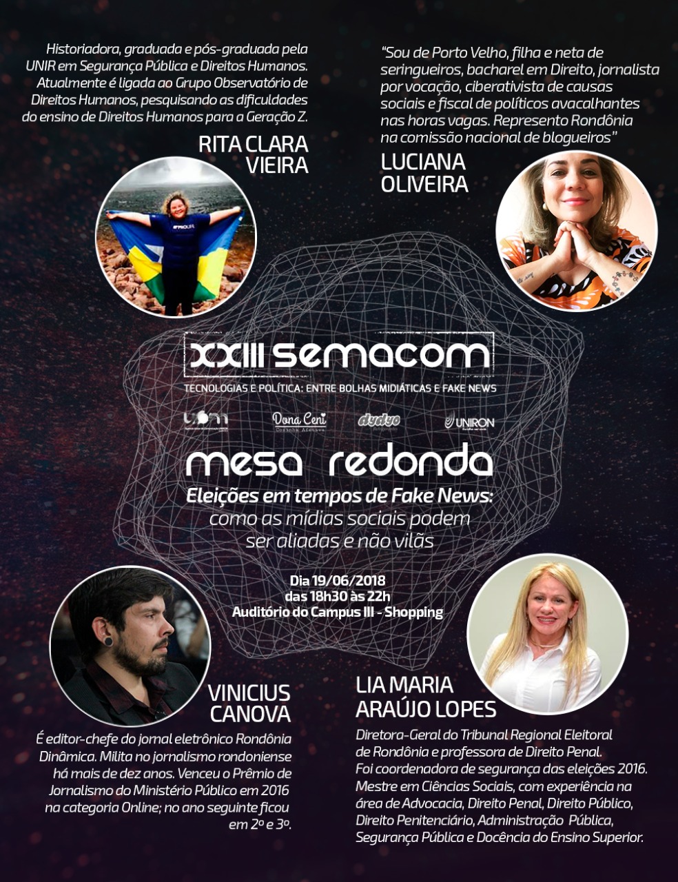 A XXIII SEMACOM - TECNOLOGIAS E POLÍTICA: ENTRE BOLHAS MIDIÁTICAS E FAKE NEWS, proporciona dinâmicas, discursões, orientações e reflexões sobre temas atuais e seus desafios no âmbito profissional, a partir de mesas redondas, palestras e oficinas. O evento acontecerá do dia 19 ao dia 22 de junho (terça a sexta) na Faculdade Uniron Campus I e no Porto Velho Shopping.