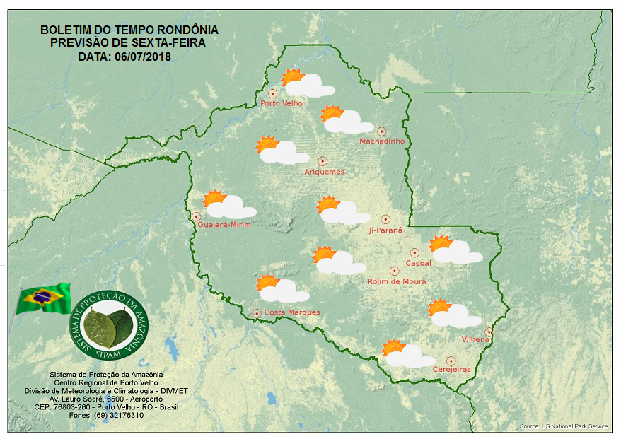 A Divisão de Meteorologia do Sistema de Proteção da Amazônia informa que a sexta-feira será de céu claro e poucas nuvens em todo o Estado, a nebulosidade varia de claro a parcialmente nublado em todas as regiões. Não há previsão de chuvas, as temperaturas seguem elevadas em todo o Estado e a umidade relativa do ar segue baixa chegando a valores próximos de 30%, caracterizando estado de atenção.