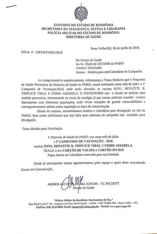 O diretor executivo da Astir, CB PM Alan Mota diz que apóia e está à disposição do Diretor de Saúde da Policia Militar, Tenente Coronel PM DENT Agnus Aécio, para auxiliar no que for possível, para que nossos valorosos Policiais possam receber a imunização de várias patologias, conforme consta no ofício de convocação do TC PM DENT Agnus que segue: