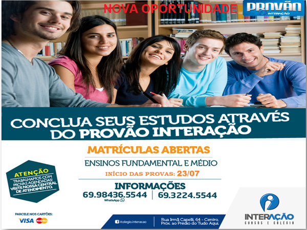 Atenção pessoal, mude de vida agora! Aproveite e faça revisão das matérias dos conteúdos da "Prova". Você que ainda sonha em concluir seus estudos, não perca tempo. Venha iniciar ou Concluir conosco no PROVÃO DO INTERAÇÃO.