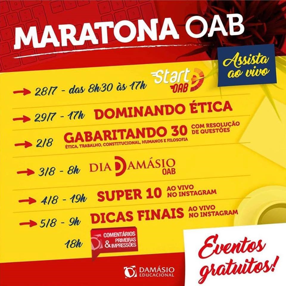 Começando neste sábado (28/07) com o Start OAB, um aulão de resolução de questões das últimas provas visto a dificuldade das questões exigidas pelo exame. A maratona contará ainda com uma série de eventos na semana que antecede a prova, sendo eles o Dominando Ética, Gabaritando 30 e o Dia Damásio.