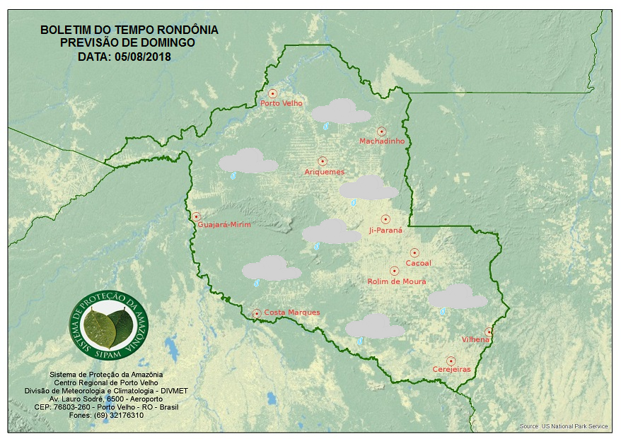 A instabilidade aumenta em Rondônia, devido a aproximação de uma frente fria ao Estado. Neste sábado, a previsão é de um dia quente e abafado em todas as áreas. No Vale do Guaporé, o tempo varia de parcialmente nublado a nublado, com pancadas isoladas de chuva e trovoadas a partir da tarde. Na Capital e nas demais regiões do Estado, o tempo varia de claro a parcialmente nublado, com possibilidade de chuva passageira a tarde.