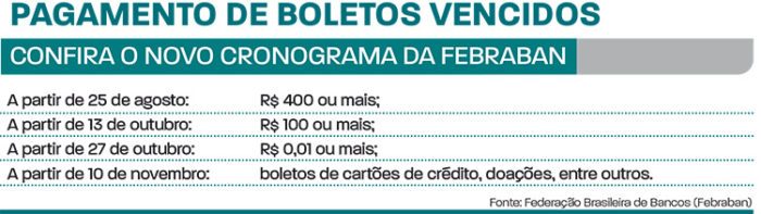 A partir do dia 25 de agosto, boletos bancários vencidos com valores entre R$ 400 e R$ 799,99 poderão ser pagos em qualquer agência bancária. A medida faz parte da Nova Plataforma de Cobrança que vem sendo implantada pela Federação Brasileira de Bancos (Febraban) desde julho de 2017. Em março deste ano, boletos vencidos acima de R$ 800 começaram a ser pagos em qualquer banco. A expectativa da entidade é que, até o fim do ano, as agências recebam boletos vencidos de qualquer valor (ver quadro com o cronograma).
