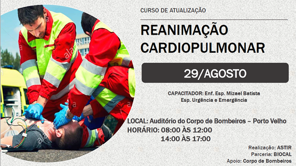 De acordo com a gestora de enfermagem da Astir, Daniele Rodrigues, será realizado o curso de reanimação pulmonar, no auditório do Corpo de Bombeiros Militar, conforme informações que seguem no banner.