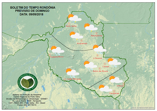 A Divisão de Meteorologia do Sistema de Proteção da Amazônia informa que a instabilidade aumenta ainda mais na região do norte do Estado nesse domingo. O céu de todo o Estado deve variar de claro a parcialmente nublado. Há previsão de pancadas isoladas de chuvas e trovoadas em toda a região do norte do Estado. No Vale do Guaporé e Leste Rondoniense, devem ocorrer pancadas isoladas de chuvas e nas demais regiões do Cone-sul não há previsão de chuvas.