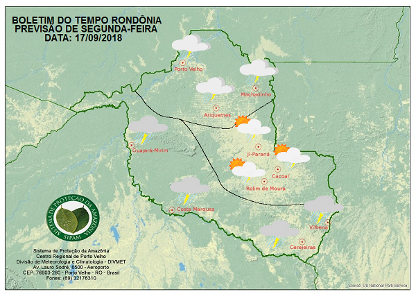 A Divisão de Meteorologia do Sistema de Proteção da Amazônia informa que o sol e o calor predominam sobre Rondônia neste fim de semana. Tanto no sábado quanto no domingo a previsão será de céu parcialmente nublado a nublado, com tempo abafado e pancadas isoladas de chuva com trovoadas a partir da tarde na capital, no Vale do Jamari e no Vale do Guaporé. Nas demais regiões do estado o tempo varia de claro a parcialmente nublado e há previsão de pancadas isoladas de chuva com trovoadas a partir da tarde.
