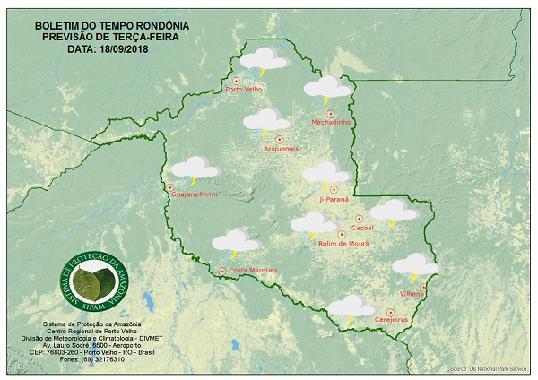 A Divisão de Meteorologia do Sistema de Proteção da Amazônia informa que com o aumento da umidade relativa do ar associada as altas temperaturas, faz com que a terça-feira seja de tempo parcialmente nublado variando a nublado.