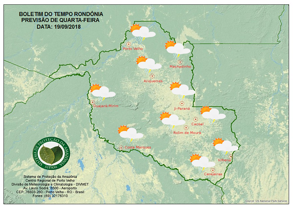 A Divisão de Meteorologia do Sistema de Proteção da Amazônia informa que a quarta-feira será de céu claro variando a parcialmente nublado.