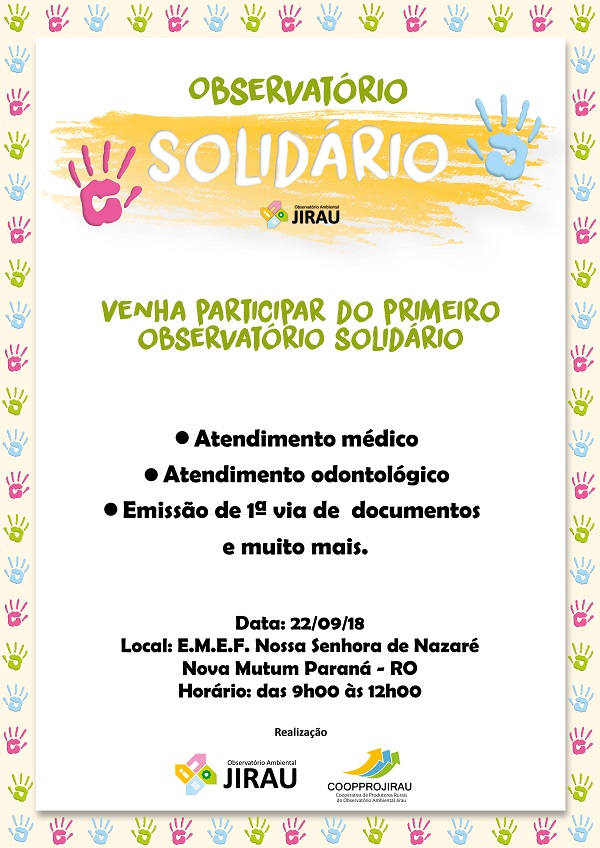 O Observatório Solidário é uma ação beneficente realizada pela Associação do Observatório Ambiental Jirau de Estudos e Desenvolvimento Sustentável (Observatório Ambiental Jirau) e Cooperativa de Produtores Rurais do Observatório Ambiental Jirau (COOPPROJIRAU). O evento acontecerá no dia 22 de setembro de 2018, das 09h às 12h, na E.M.E.F. Nossa Senhora de Nazaré, em Nova Mutum Paraná. A ação contará com atendimento médico, orientações dentárias, emissão da primeira via de documentos, doação de mudas, esporte, lazer, corte de cabelo, dentre outras atividades.