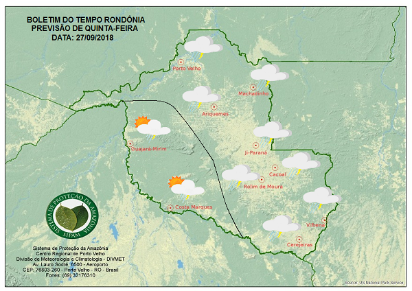 A exceção será no Vale do Guaporé e Mamoré onde o céu permanece variando de claro a parcialmente nublado, e as chuvas ocorrem como pancadas isoladas e trovoadas.
