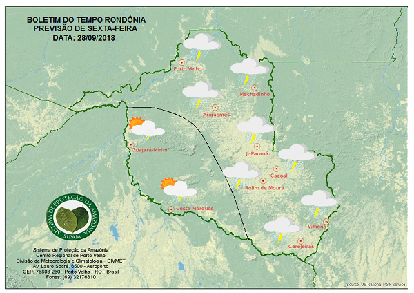 A Divisão de Meteorologia do Sistema de Proteção da Amazônia informa que ainda há bastante instabilidade atmosférica em todo Estado. Com isso o tempo varia entre parcialmente nublado e nublado em grande parte de Rondônia. Nessa região há o risco de ocorrências de chuvas forte seguidas de trovoadas.