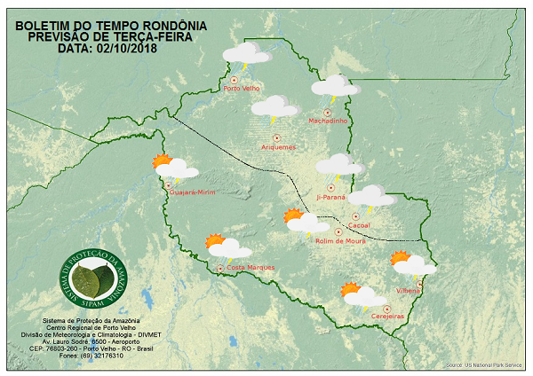 A Divisão de Meteorologia do Sistema de Proteção da Amazônia informa que esta terça-feira será quente e abafada em Rondônia. Na capital e nas regiões do Vale do Jamari, central e da Zona da Mata o dia será de sol entre muitas nuvens, muito calor e céu variando de parcialmente nublado a nublado e tem previsão de pancadas de chuva e trovoadas a partir da tarde, que poderão vir acompanhadas de ventanias. Nas demais regiões do Estado, o sol ainda predomina na maior parte do dia e a previsão é de céu variando de claro a parcialmente nublado e deve ocorrer pancadas isoladas de chuva e trovoadas entre a tarde e à noite.