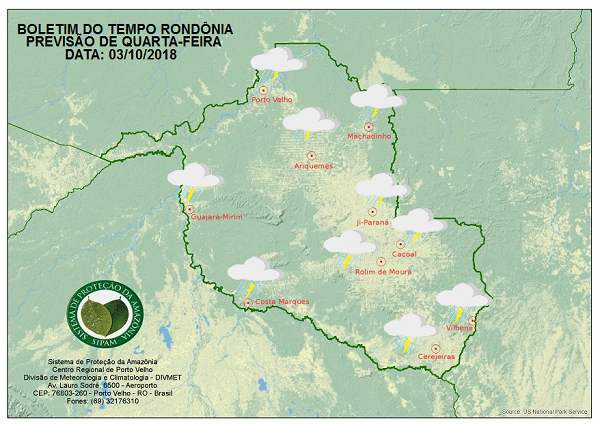 A Divisão de Meteorologia do Sistema de Proteção da Amazônia informa que o tempo deve ficar instável em toda Rondônia nesta quarta-feira. A previsão para todo o Estado, inclusive a capital Porto Velho é de céu variando de parcialmente nublado a nublado com pancadas de chuvas e trovoadas a partir da tarde da tarde, com possibilidades de temporais e ventania em todas as regiões rondonienses.