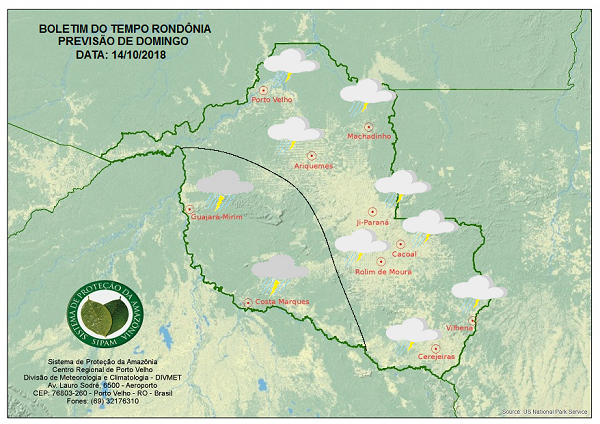 A Divisão de Meteorologia do Sistema de Proteção da Amazônia informa que o tempo pouco mudo no Estado. O céu permanecerá variando de parcialmente nublado a nublado em todo centro-sul do Rondoniense, Nessa região as chuvas ocorrem como pancadas isoladas seguidas de trovoadas. Nas demais áreas do centro-norte e do oeste, inclusive na Capital Porto Velho, o céu permanecerá nublado. A previsão é de pancadas de chuvas e trovoadas para esse sábado.