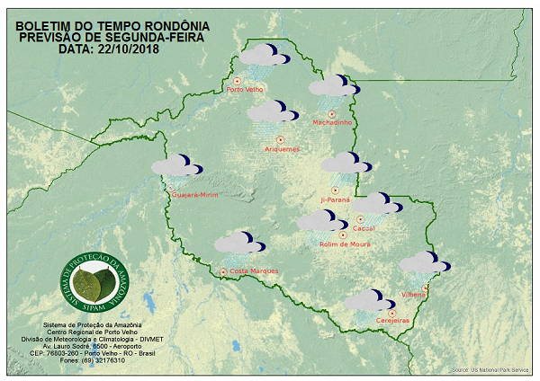 A Divisão de Meteorologia do Sistema de Proteção da Amazônia informa que a instabilidade aumenta em Rondônia neste início de semana. A previsão para todo o Estado inclusive a capital Porto velho é céu nublado a encoberto com chuva a qualquer hora do dia.