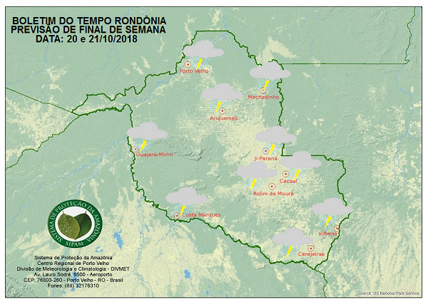 A Divisão de Meteorologia do Sistema de Proteção da Amazônia informa que áreas de instabilidade aumentam em Rondônia neste final de semana. A previsão para todo o Estado, inclusive na capital Porto Velho é que teremos o sábado e o domingo de céu nublado, sol entre muitas nuvens e com pancadas de chuva e trovoadas que podem ocorrer a qualquer hora do dia. Há possibilidade de temporais isolados em todo o Estado no decorrer do final de semana .