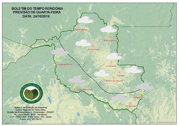 A Divisão de Meteorologia do Sistema de Proteção da Amazônia informa que a instabilidade ainda predomina Rondônia nesta quarta-feira. A previsão é de um dia de céu nublado com pancadas de chuva e trovoadas a qualquer hora do dia e com risco de temporais isolados no Vale do Guaporé e no Sul do Estado.