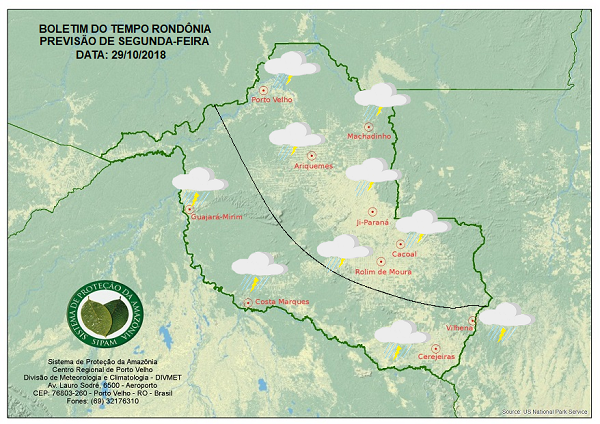 A Divisão de Meteorologia do Sistema de Proteção da Amazônia informa que o tempo ficará mais instável nesse começo de semana. O céu de todo Estado deve variar de parcialmente nublado a nublado. As pancadas de chuvas podem ser acompanhadas de trovoadas em todas as regiões. Porém com exceção do Vale do Guaporé e Mamoré, nas demais áreas do Estado inclusive na Capital Porto Velho, as pancadas de chuvas e trovoadas ocorrem de forma isolada.