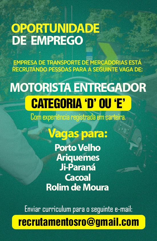 Com experiência registrada em carteira. Vagas para Porto Velho, Ariquemes, Ji-Paraná, Cacoal, Rolim de Moura