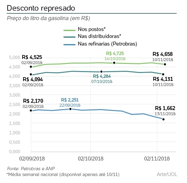 O litro da gasolina produzida e vendida pela Petrobras nas refinarias bateu o recorde de R$ 2,251 em setembro. Desde o dia 22 daquele mês, porém, a estatal vem reduzindo paulatinamente o valor praticado, que está em R$ 1,662 desde esta terça-feira (12), data do último reajuste. A queda total no período foi de 26,2%.