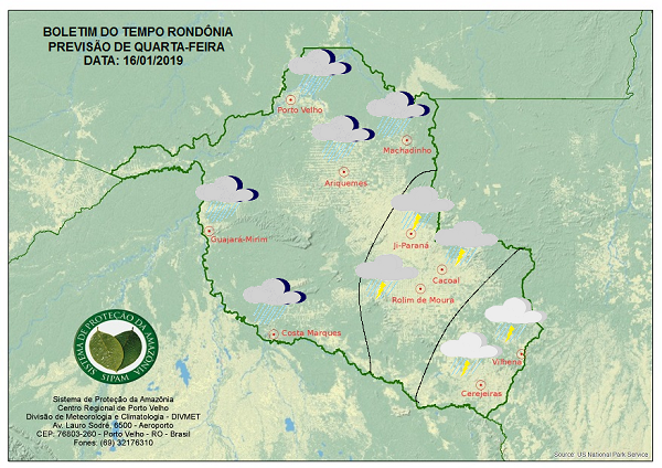 A Divisão de Meteorologia do Sistema de Proteção da Amazônia informa que o sol aparece por entre nuvens no cone sul Rondoniense. Nessa região o tempo varia de parcialmente nublado a nublado, porém entre a tarde e a noite podem ocorrer pancadas de chuvas seguidas de trovoadas, assim como na região leste do Estado, nessas áreas o céu permanecerá nublado durante todo o dia. No centro-norte e oeste do Estado o tempo varia de nublado a encoberto e o dia deverá ser chuvoso.