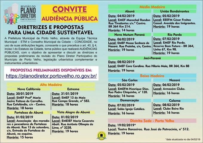 A audiência pública que integra o processo de revisão do Plano Diretor Participativo do Município de Porto Velho será realizada no próximo dia 19 de fevereiro, no Teatro Banzeiros, às 19h00. O evento deveria ter acontecido em 29 de janeiro, mas foi adiado.