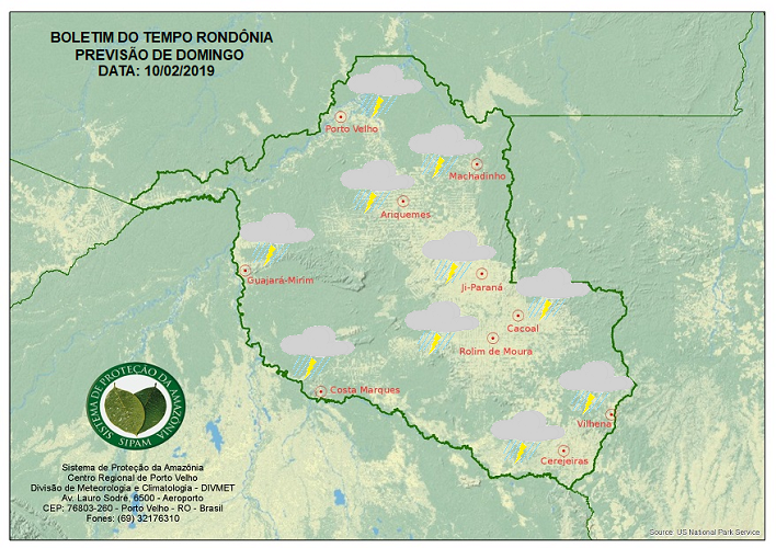 A Divisão de Meteorologia do Sistema de Proteção da Amazônia informa que no domingo áreas de instabilidade ainda se espalham por todo o Estado, inclusive na Capital Porto Velho, e a previsão é de céu nublado, com sol entre muitas nuvens e pancadas de chuvas e trovoadas a partir da tarde.