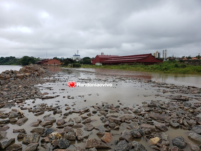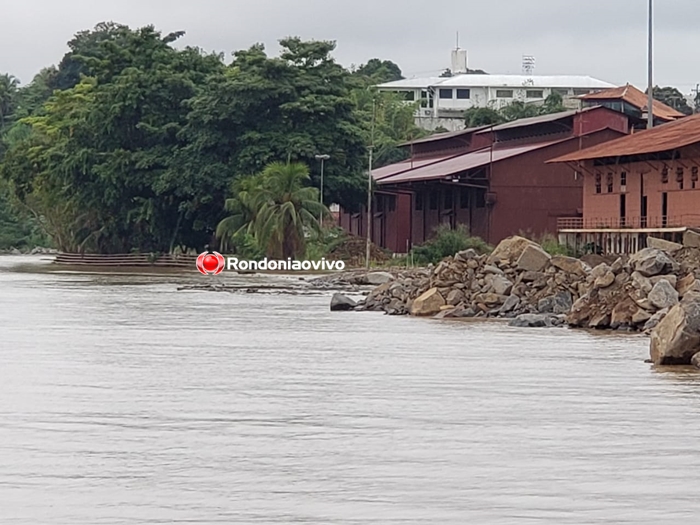 Na região que abriga o sítio histórico da Estrada de Ferro Madeira Mamoré, uma ação da prefeitura com a instalação de rochas bloqueou o avanço da água sob a praça e o pátio de máquinas.