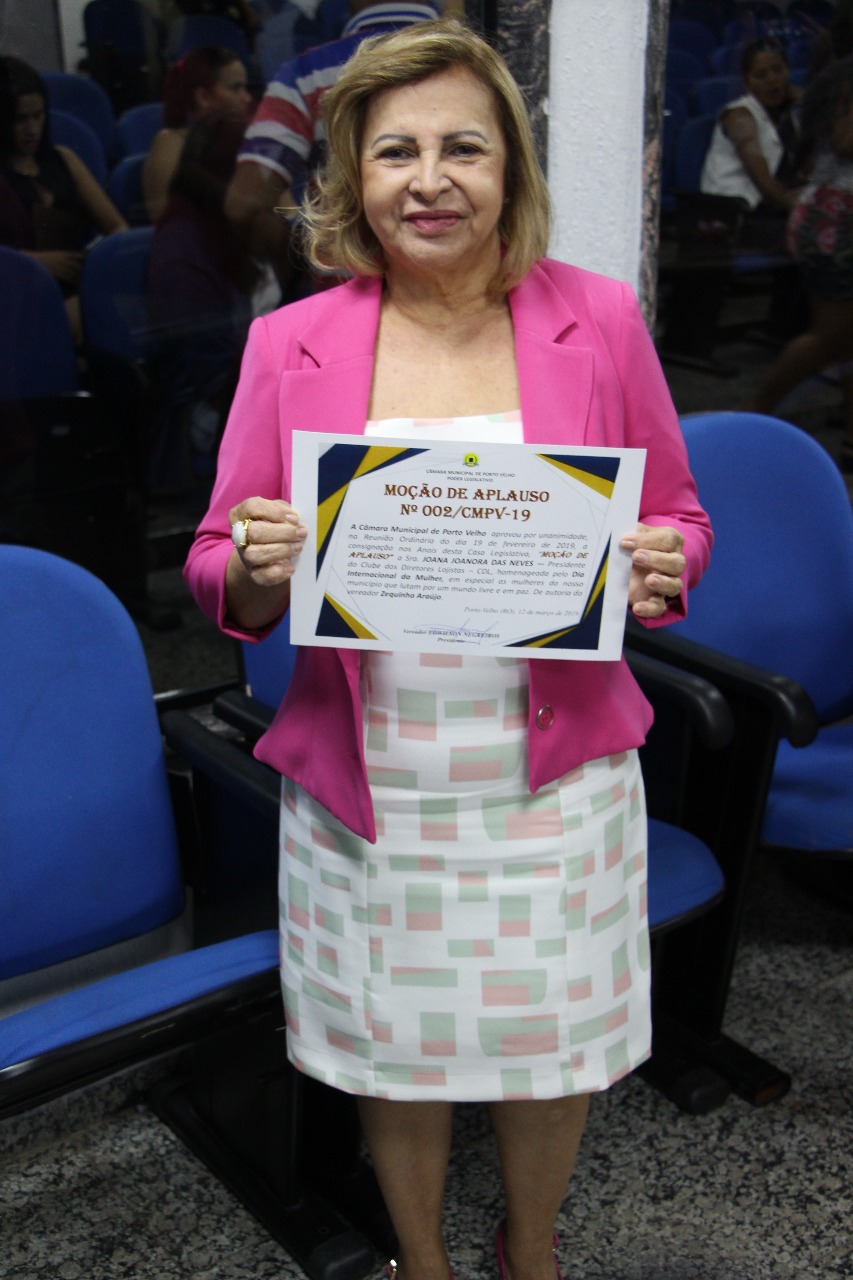 A presidente da CDL Porto Velho, Joana Joanora das Neves, foi homenageada, na última terça-feira (12), e recebeu Moção de Aplauso pelo Dia Internacional da Mulher, concedida pela Câmara de Vereadores da Capital. A indicação da homenagem foi feita pelo vereador Zequinha Araújo. Joana Joanora agradeceu o reconhecimento e garantiu que essa honraria é uma motivação a mais para continuar lutando em favor do segmento do comércio varejista de Porto Velho.