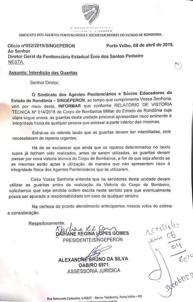 Nesta segunda-feira (08), o Singeperon protocolou ofício junto ao diretor geral do presídio Ênio Pinheiro de Porto Velho, informando que conforme o relatório de vistoria técnica N°014/2018 do Corpo de Bombeiros Militar, as guaritas apresentam sérios riscos a integridade física dos servidores.