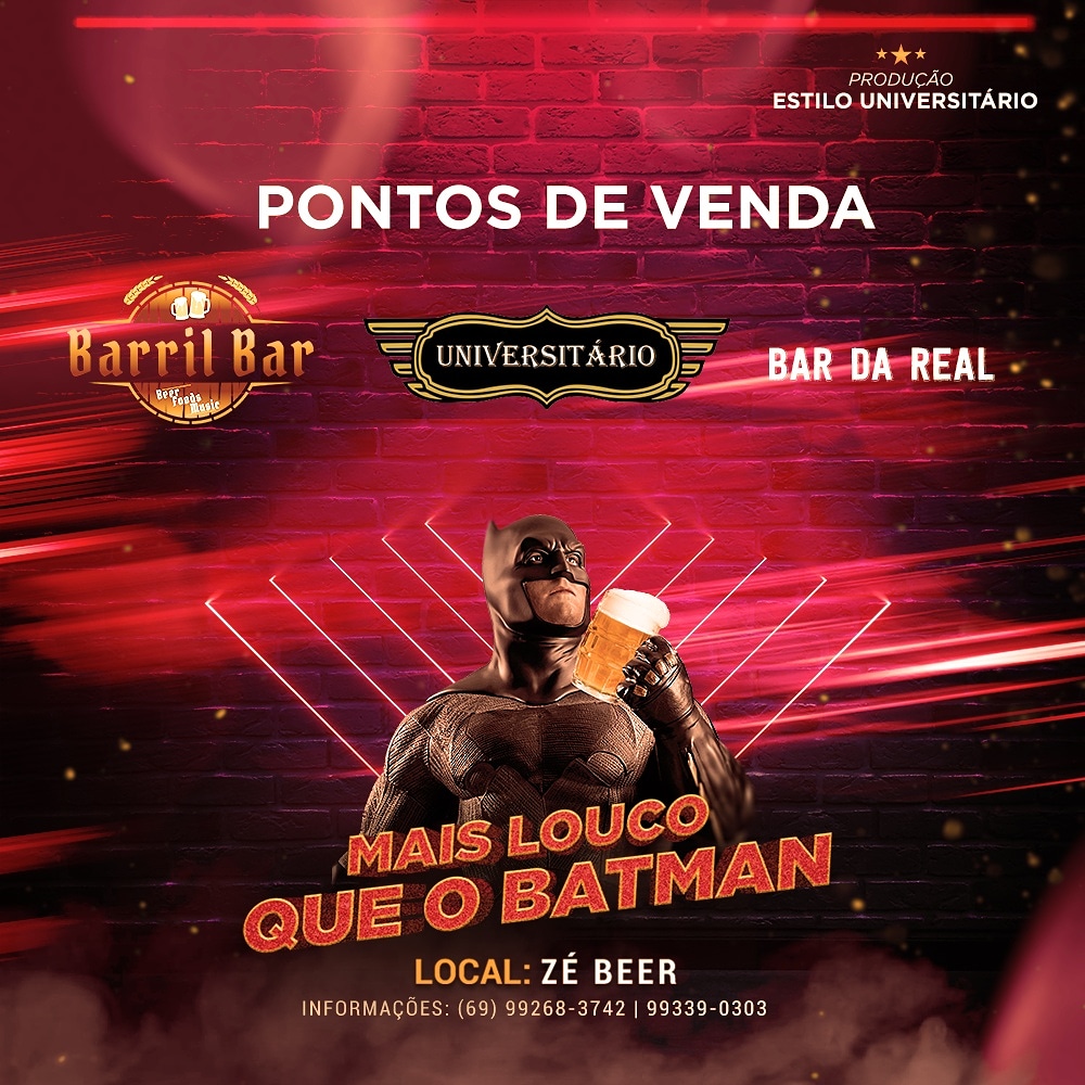 Dia 20 de abril acontece a festa em que você vai te deixar Mais Louco que o Batman. Salve a data e garanta já o seu ingresso! Open bar de cerveja, suco gummy e água em uma das casas de evento mais tradicionais de Porto Velho, o Zé Beer.