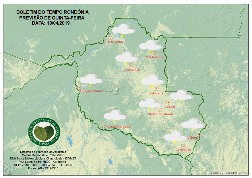 A Divisão de Meteorologia do Sistema de Proteção da Amazônia informa que o tempo continua instável em Rondônia nesta quinta-feira. A previsão para todo o Estado, inclusive a Capital Porto Velho, é de céu parcialmente nublado a nublado com pancadas de chuvas e trovoadas em áreas isoladas, principalmente no período da tarde e noite.