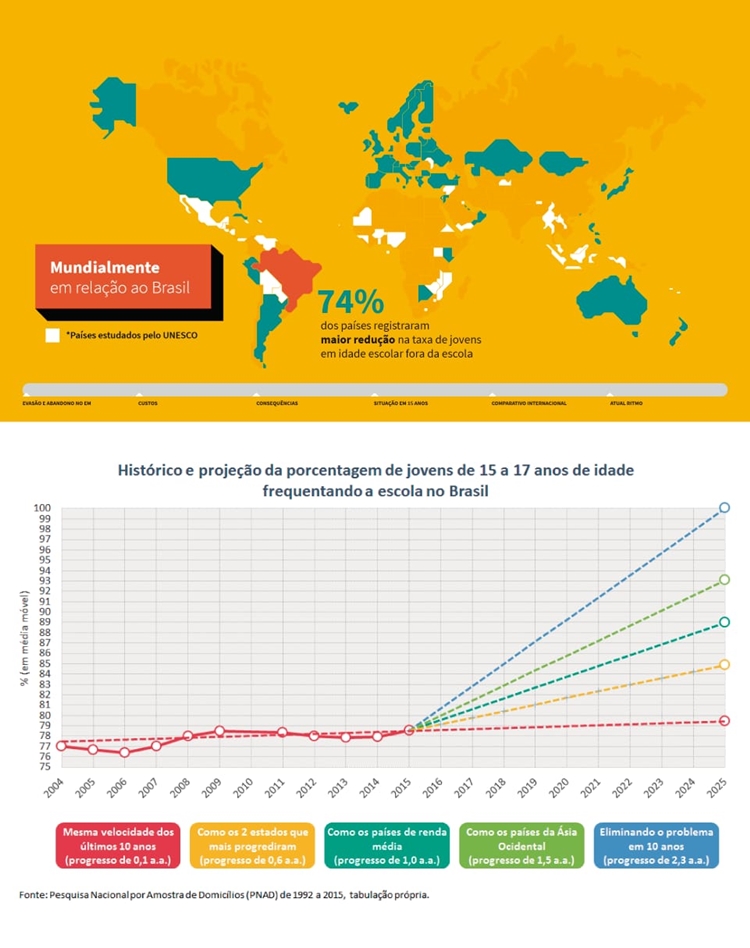Se o Brasil conseguisse manter 100% dos jovens em fase escolar no ensino médio, 100 bilhões de reais de recursos deixariam de ser perdidos direta e indiretamente. Os países que diminuíram a criminalidade e a geração de emprego e renda estão ligados diretamente a investimentos pesados em educação principalmente da faixa etária entre 15 e 19 anos.