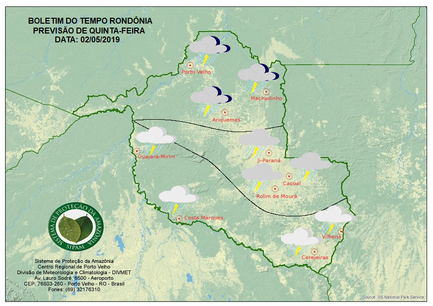 A Divisão de Meteorologia do Sistema de Proteção da Amazônia informa que a instabilidade atmosférica deverá se elevar ainda mais, principalmente nas regiões ao norte do Estado. Nessa região o tempo deverá variar de nublado a encoberto e há previsão de pancadas de chuvas e trovoadas a qualquer hora. Nos vale do Guaporé e Mamoré, o tempo varia de parcialmente nublado a nublado. Nas demais áreas do Estado o tempo deverá permanecer nublado durante todo o dia. Em ambas as regiões a previsão será de pancadas de chuvas e trovoadas, que ocorrem entre a tarde e a noite.
