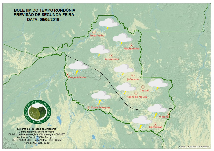 A Divisão de Meteorologia do Sistema de Proteção da Amazônia informa que neste começo de semana o sol e calor predomina em Rondônia. A previsão é de céu parcialmente nublado a nublado em todo o Estado, com sol forte pela manhã e aumento de nuvens no decorrer do dia. Na Capital, no Vale do Jamari e na região central do Estado a previsão é de pancadas isoladas de chuva e trovoadas entre a tarde e noite. Nas demais regiões rondonienses ocorrem pancadas de chuva com trovoadas a partir da tarde.