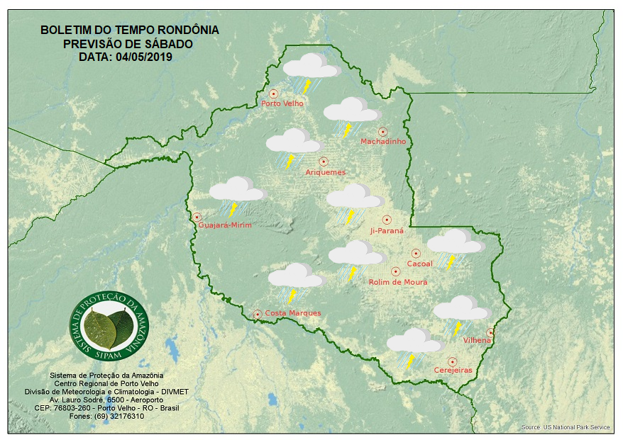 A Divisão de Meteorologia do Sistema de Proteção da Amazônia informa que ao longo deste fim de semana o tempo será quente e abafado em Rondônia. Para o sábado, na Capital e demais regiões rondonienses, o dia será de sol forte e calor, com o tempo variando de parcialmente nublado a nublado e ocorrem pancadas de chuva com trovoadas a partir da tarde.