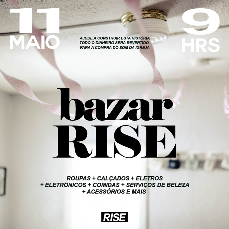 A Rise Church realiza neste próximo sábado, dia 11 de maio o “Bazar Rise”. A ideia é angariar fundos para a compra do som da igreja que será oficialmente inaugurada ainda neste ano de 2019 em Porto Velho. Serão roupas, calçados, acessórios e eletro eletrônicos vendidos a um preço simbólico. Também serão ofertados serviços de beleza, como maquiagem, serviços de barbearia e design de sobrancelhas. “Estamos animados com o que estamos construindo” destacou o líder e pastor Lucas Rômulo.