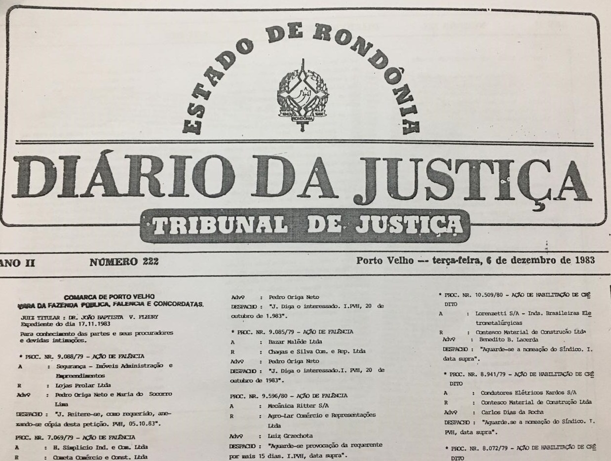 Em sua página 3, o Diário do Tribunal de Justiça fez saber que a Comissão Organizadora designada pelas Portarias 104/83 E 105/83 tornava pública a lista dos aprovados no Concurso Público para provimento dos cargos da classe inicial da categoria funcional de Técnico Judiciário do Tribunal de Justiça e de Técnico Judiciário da Justiça de 1º Grau da comarca de Porto Velho.