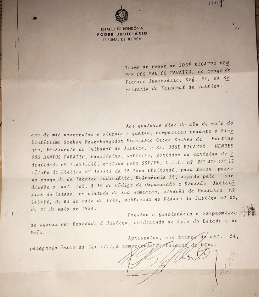“Passados 35 anos, o sentimento que tenho é de dever cumprido, minha missão no serviço público do Judiciário já está se encerrando, com êxito e saldo positivo”, diz Ricardo Paraízo, 1º colocado no primeiro concurso público realizado pelo Tribunal de Justiça de Rondônia em 1983.